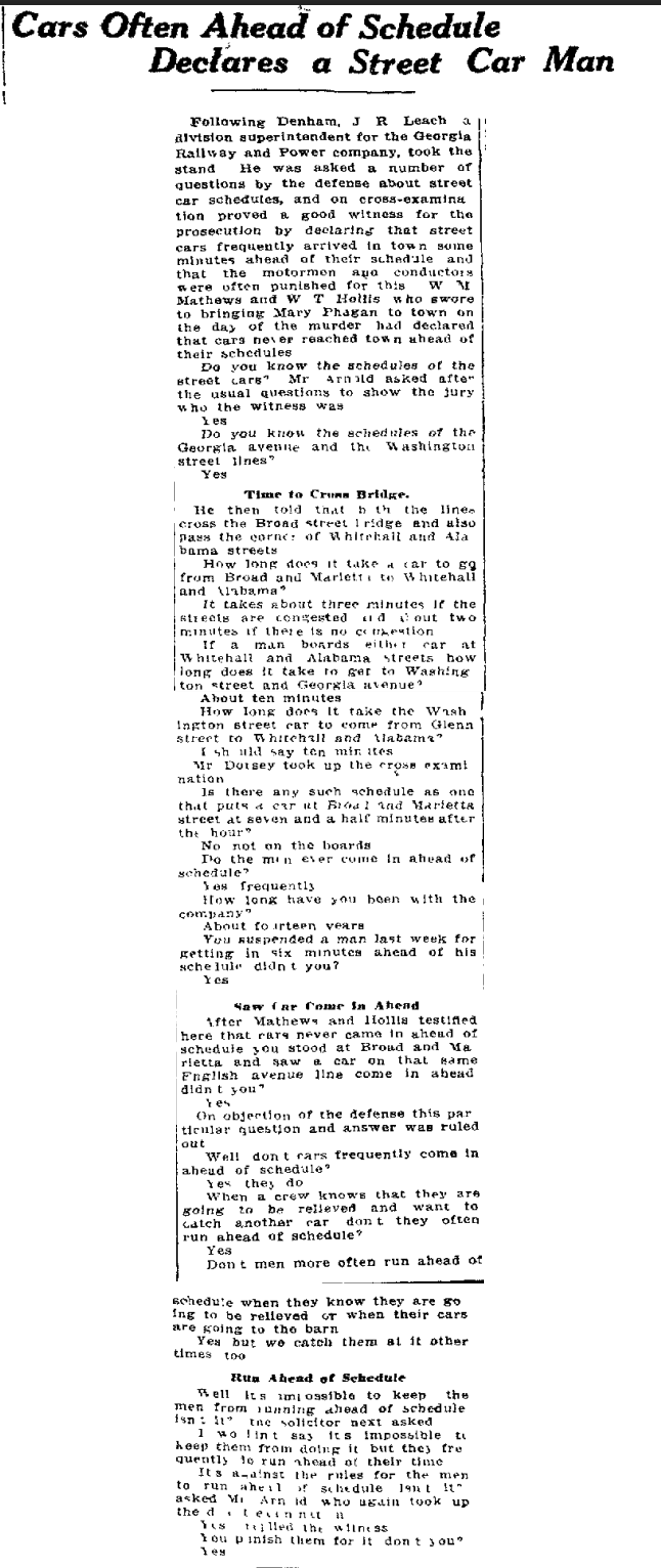 Following Denham, J. R. Leach, a division superintendent for the Georgia Railway and Power company, took the stand. He was asked a number of questions by the defense about street car schedules, and on cross-examination proved a good witness for the prosecution by declaring that street cars frequently arrived in town some minutes ahead of their schedule and that the motorman and conductors were often punished for this. W. M. Mathews and W. T. Hollis who swore to bringing Mary Phagan to town on the day of the murder had declared that cars never reached town ahead of their schedules.