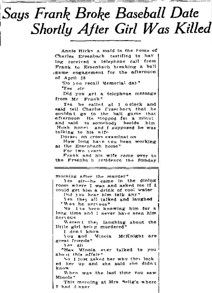 Annie Hicks, a maid in the home of Charles Ersenbach, testified to having received a telephone call from Frank to Ersenbach, breaking a ball game engagement for the afternoon of April 26.
