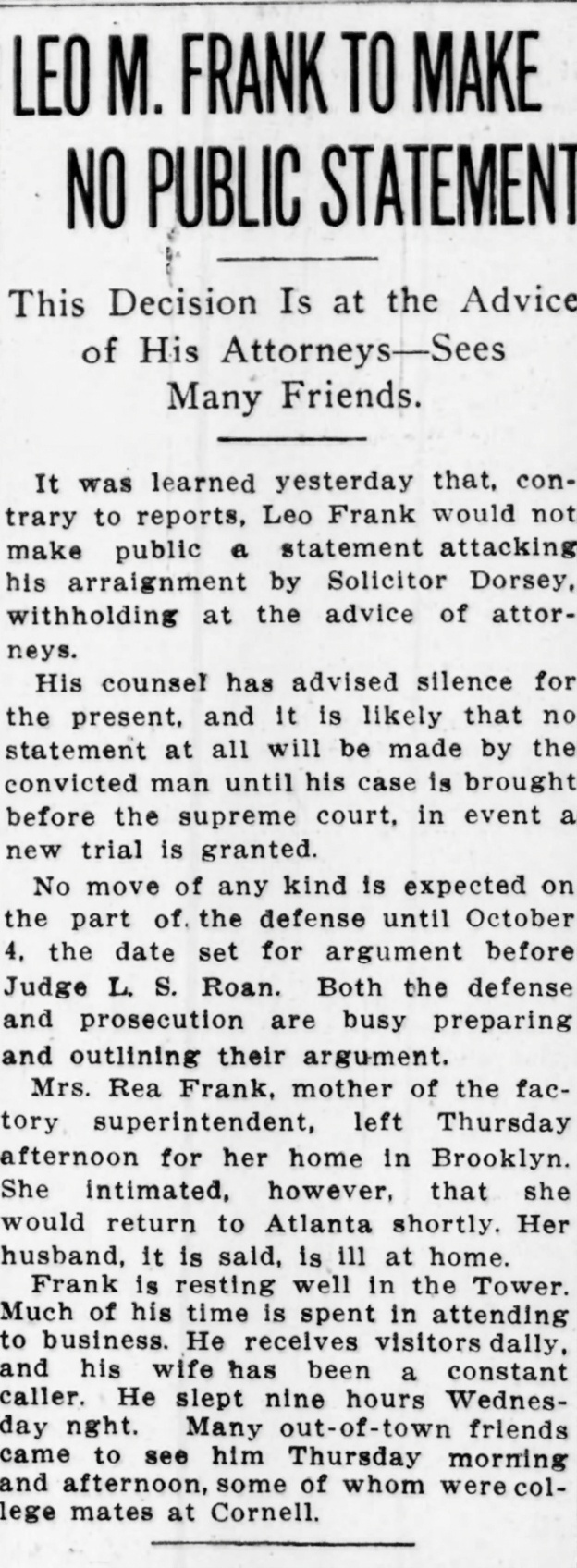It was learned yesterday that, contrary to reports, Leo Frank would not make public a statement attacking his arraignment by Solicitor Dorsey, withholding at the advice of attorneys.