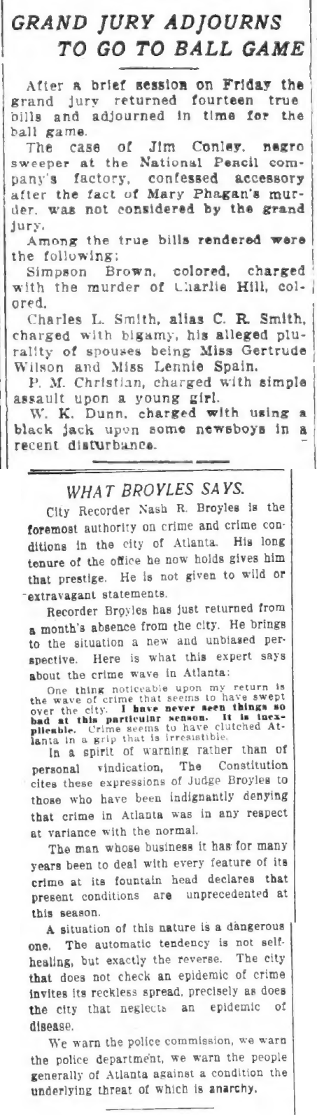 The Constitution cites these expressions of Judge Broyles to those who have been indignantly denying that crime in Atlanta was in any respect at variance with the normal.