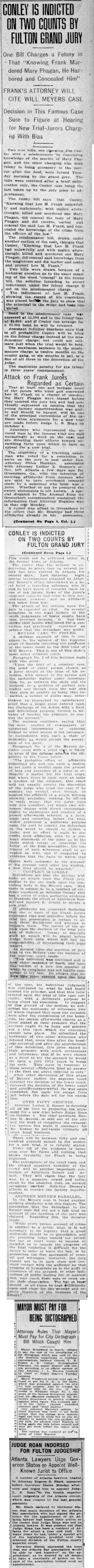 Two true bills, one charging Jim Conley with a misdemeanor "in concealing knowledge of the murder of Mary Phagan, and the other charging him with felony in being accessory to the murder after the deed, were turned Tuesday morning by the grand jury. The bills were returned after a brief deliberation only, the Conley case being the last taken up by the jury prior to adjournment.