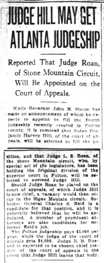 While Governor John M. Slaton has made no announcement of whom he expects to appoint to fill the fourth judgeship recently created in Fulton County, it is rumored that Judge Benjamin Harvey Hill, of the Court of Appeals, will be selected to fill the position, and that Judge Leonard Strickland Roan, of the stone Mountain circuit, who, by special act of the legislature, has been holding the criminal division of the superior court in Fulton, will be selected to succeed Judge Hill.