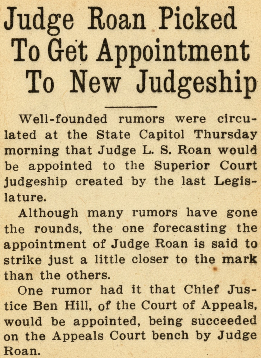 Well-founded rumor were circulated at the State Capitol Thursday morning that Judge L. S. Roan would be appointed to the Superior Court judgeship created by the last Legislature.