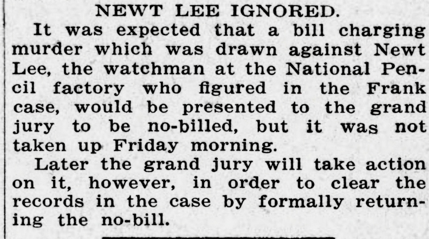 It was expected that a bill charging murder which was drawn against Newt Lee, the watchman at the National Pencil factory who figured in the Frank case, would be presented to the grand jury, to be no-billed, but it was not taken up Friday morning.
