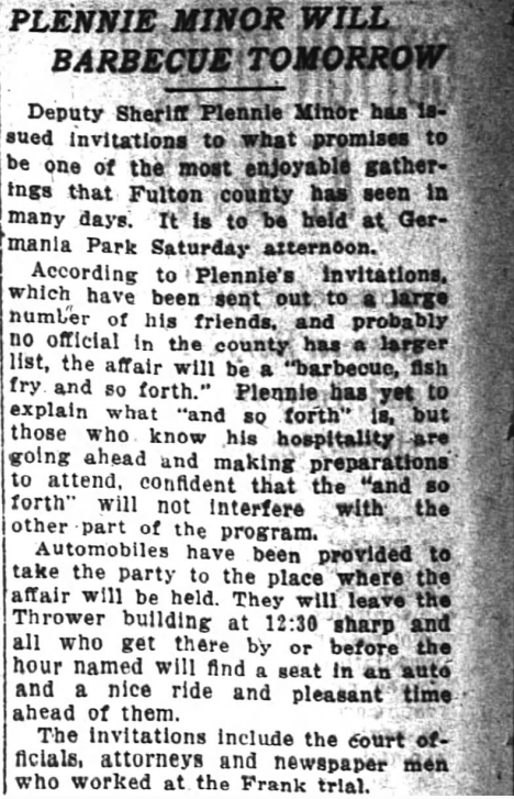 Deputy Sheriff Plennie Minor, has issued invitations to what promises to be one of the most enjoyable gatherings that Fulton County has seen in many days. It is to be held at Germania Park, Saturday afternoon.