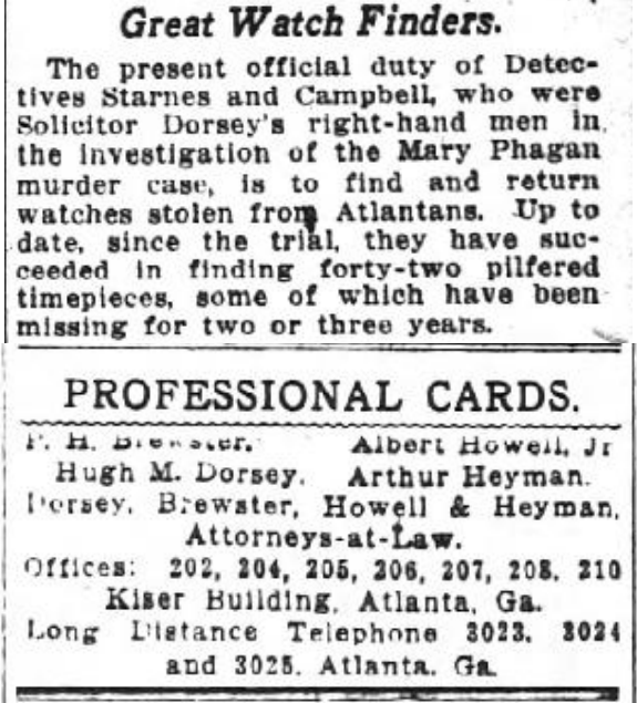 The present official duty of Detectives Starnes and Campbell, who were Solicitor Dorsey's right-hand men in the investigation of the Mary Phagan murder case, is to find and return watches stolen from Atlantans. Up to date, since the trial, they have succeeded in finding forty-two pilfered timepieces, some of which have been missing for two or three years.