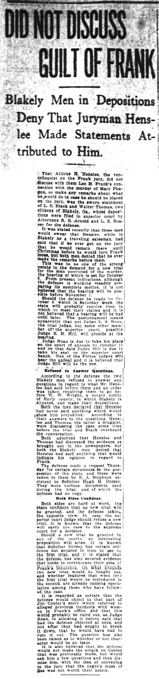 That Atticus H. Henslee, the ventriloquist on the Frank jury, did not discuss with them Leo M. Frank's connection with the murder of Mary Phagan, or make any remarks about what he would do in case should he be placed on the jury, was the sworn statement of L. E. Blac and Walter Thomas, two citizens of Blakely, Ga., whose depositions were filled in superior court by Attorneys Reuben R. Arnold and L. Z. Rosser for the defense.