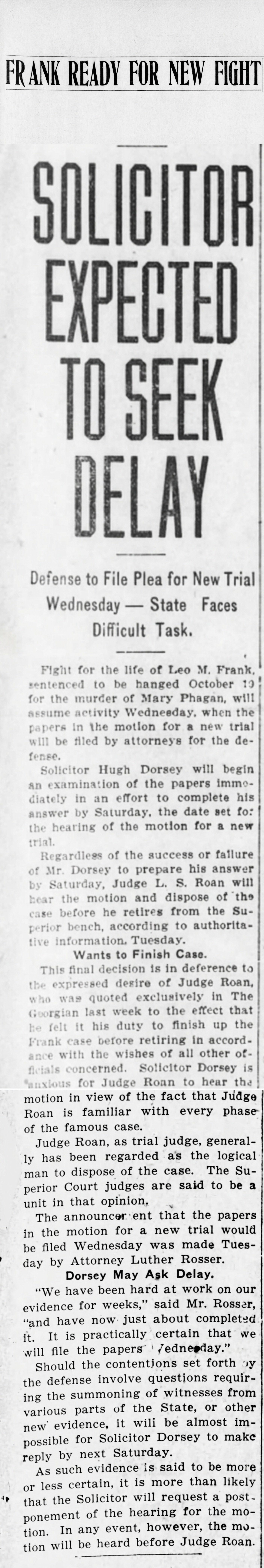 The final decision is in deference to the expressed desire of Judge Roan who was quoted exclusively in the Georgian last week exclusively in The Georgian last week to the effect that he felt it his duty to finish up the Frank case before retiring in accordance with the wishes of all other officials concerned. Solicitor Dorsey is anxious for Judge Roan to hear the motion in view of the fact that Judge Roan is familiar with every phase of the famous case.