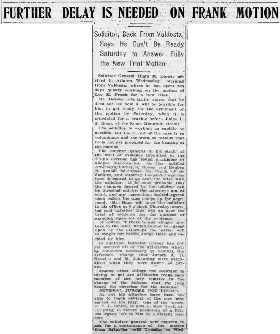Wednesday, 15th October 1913: Further Delay Is Needed On Frank Motion, The Atlanta Journal PDF