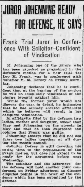 Johenning one of the jurors who has been attacked as prejudiced in the defense's motion for a new trail for Leo M. Frank, was in conference with Solicitor H. M. Dorsey on Friday morning.