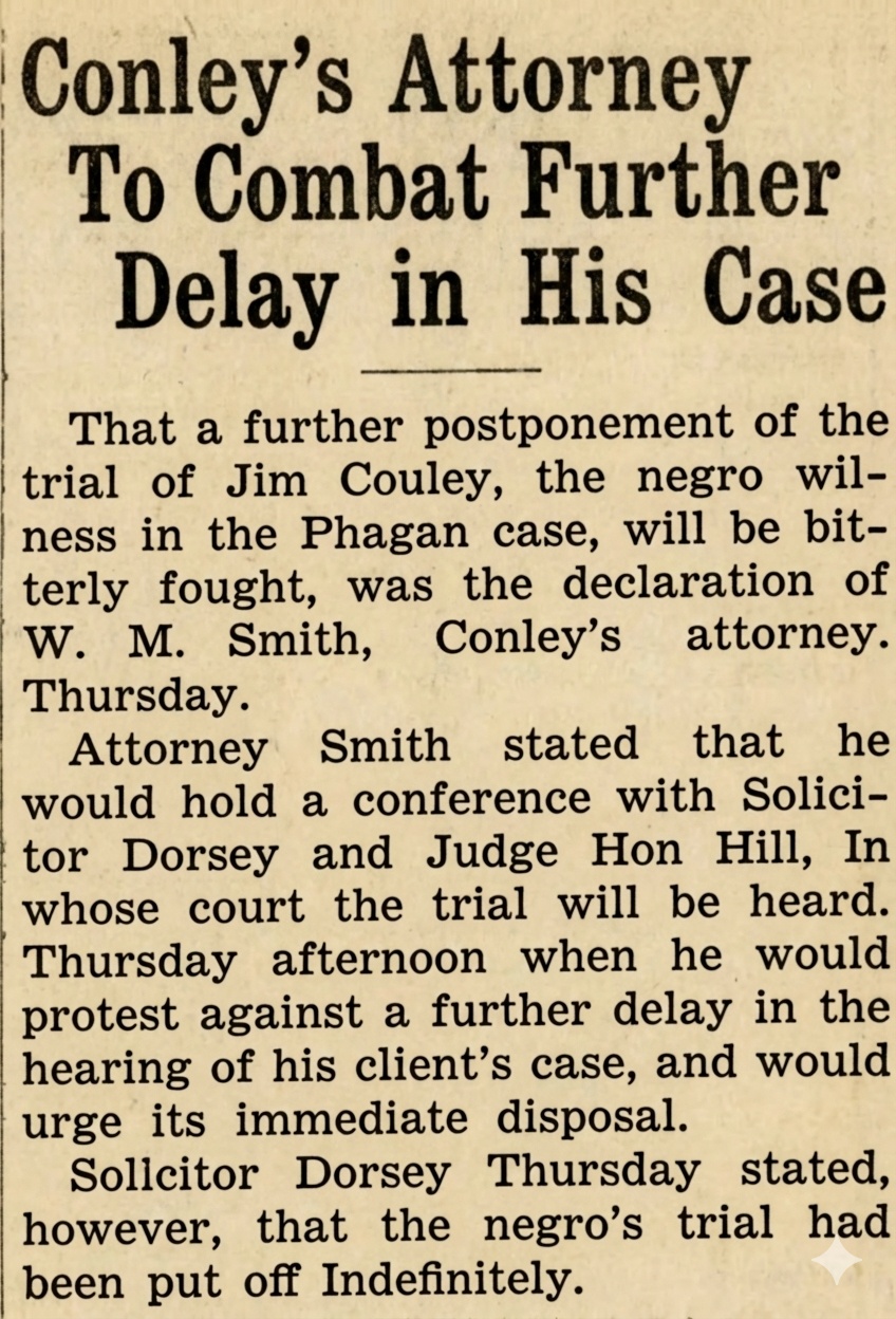 Attorney Smith stated that he would hold a conference with Solicitor Dorsey and Judge Ben Hill, in whose court the trial will be heard, Thursday afternoon when he would protest against a further delay in the hearing of his client's case, and would urge its immediate disposal.
