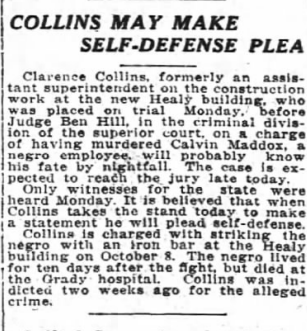 Clarence Collins, formerly an assistant superintendent on the construction work at the new Healy building, who was placed on trial Monday, before Judge Ben Hill, in the criminal division of the superior court, on a charge of having murdered Calvin Maddox, a negro employee, will probably know his fate by nightfall.