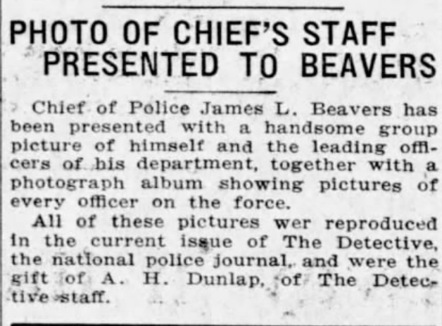 Chief of Police James L. Beavers has been presented with a handsome group picture of himself and the leading officers of his department, together with a photograph album showing pictures of every officer on the force.