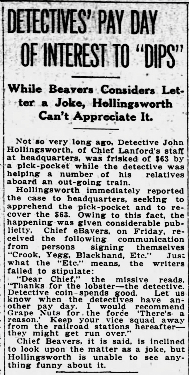 Not so very long ago, Detective John Hollingsworth, of Chief Lanford's staff at headquarters, was frisked of $63 by a pick-pocket while the detective was helping a number of his relatives aboard an out-going train.