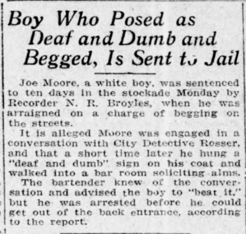 Joe Moore, a white boy, was sentenced to ten days in the stockade Monday by Recorder N. R. Broyles, when he was arraigned on a charge of begging on the streets.