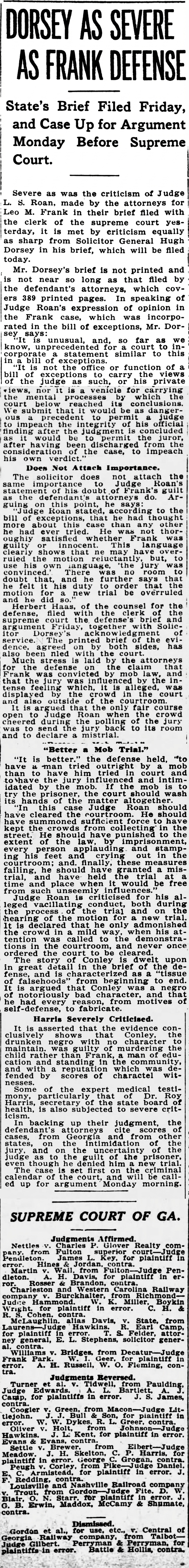 Severe as was the criticism of Judge L. S. Roan, made by the attorneys for Leo M. Frank in their brief filed with the clerk of the supreme court yesterday, it is met by criticism equally as sharp from Solicitor General Hugh Dorsey in his brief, which will be filed today.
