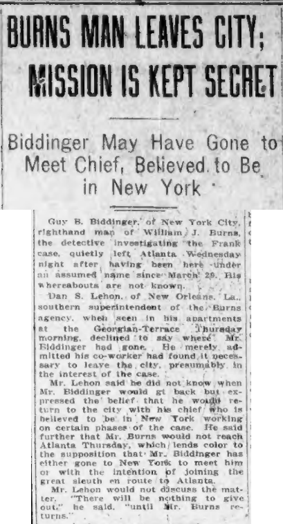 Mr. Lehon said he did not know when Mr. Biddinger would return but expressed the belief that he would come back to the city with his chief, who is believed to be in New York working on certain phases of the case. He further stated that Mr. Burns would not reach Atlanta on Thursday, which lends color to the supposition that Mr. Biddinger has either gone to New York to meet him or with the intention of joining the great sleuth en route to Atlanta.
