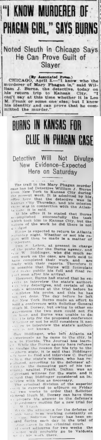 The trial in the Mary Phagan murder case has led Detective William J. Burns from New York to Kansas City during the present week. It is admitted by his office here that the detective was in Kansas City Thursday, and his mission there was in connection with the Atlanta case, it is said.
