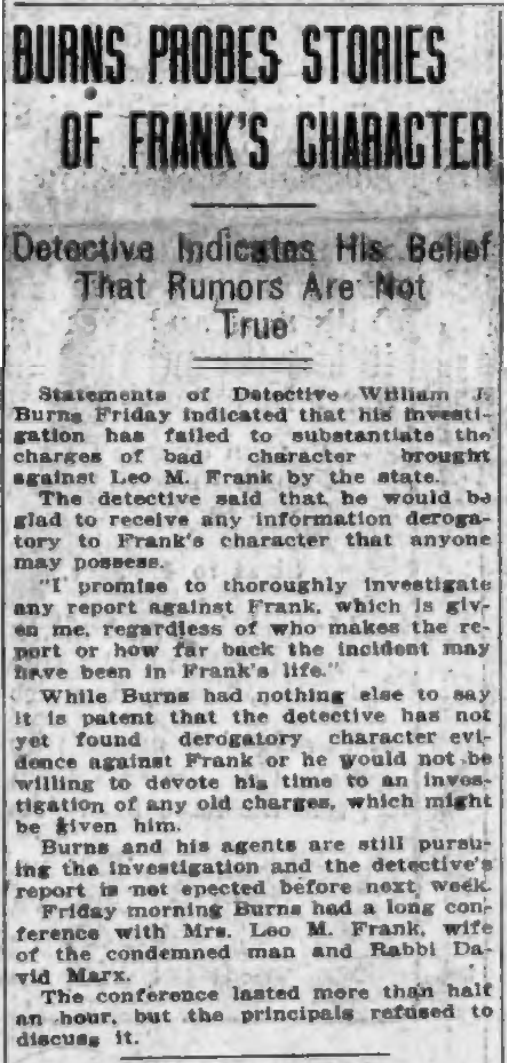 While Burns had nothing else to say, it is clear that the detective has not yet found derogatory character evidence against Frank. If he had, he would not be willing to devote his time to investigating any old charges that might be brought to his attention. Burns and his agents are still pursuing the investigation, and the detective's report is not expected before next week.