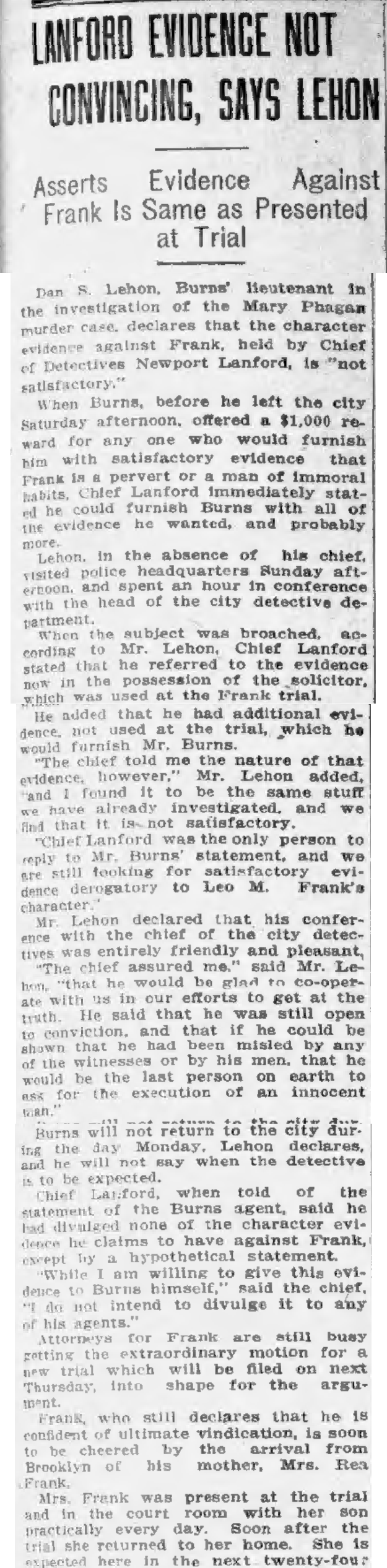 Dan S. Lehon, Burns' lieutenant in the investigation of the Mary Phagan murder case, declares that the character evidence against Frank, held by Chief of Detectives Newport Lanford, is "not satisfactory." When Burns, before he left the city Saturday afternoon, offered a $1,000 reward for anyone who would furnish him with satisfactory evidence that Frank is a pervert or a man of immoral habits, Chief Lanford immediately stated he could furnish Burns with all of the evidence he wanted, and probably more.