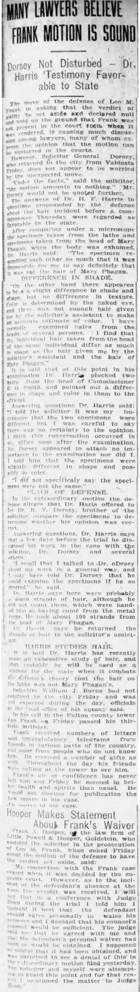 It is said Dr. Harris was recently made an exhaustive study of hair, and that probably he will be used as a witness for the state when it combats the defense's theory that the hair on the lathe was not Mary Phagan's. Detective William J. Burns had not returned to the city on Friday and was not expected during the day, officials at the local office of his agency said.