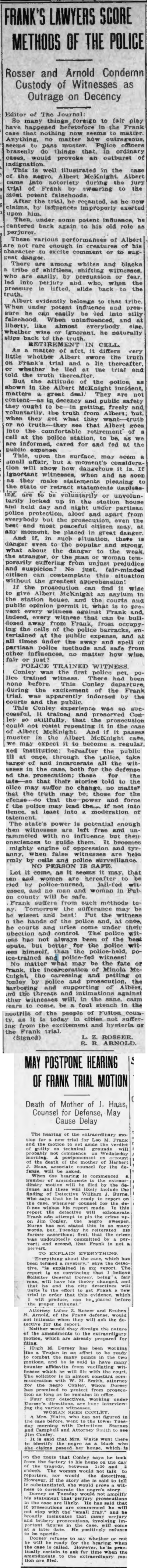 Let it come, as it seems it may, that men and women are hereafter to be tried by police-nursed, jail-fed witnesses, and no man and woman in Fulton County will be safe. Frank suffers from such methods today. Tomorrow the sufferance may be the wisest and best! Put the witness in the hands of the police and, at once, the courts and juries come under their subsection and control. The police witness has not always been of the best repute, but better for the police witness himself, than the police-held, police-trained and police-fed witness! No matter what may be the fate of Frank, the incarceration of Minola Mc Knight, the caressing and petting of Conley by police and prosecution, the harboring and supporting of Albert, and the threats and intimations against other witnesses will, in the sane, calm years to come, be a foul stench in the nostrils of the people of Fulton County, as it is today in cities not suffering from the excitement and hysteria of the Frank Trial.
