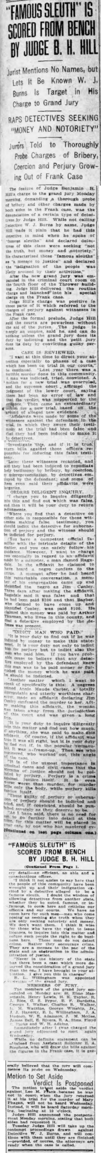 In a significant development during Judge Benjamin H. Hill's charge to the grand jury on Monday morning, he demanded a thorough investigation into bribery and other allegations stemming from the Frank case. While not explicitly naming Detective W. J. Burns, Judge Hill made it clear that his remarks targeted this detective when he criticized "famous sleuths" for seeking "not the truth, but money and notoriety." He labeled these detectives as a "menace to justice" and stated that their actions justifiably aroused public indignation.