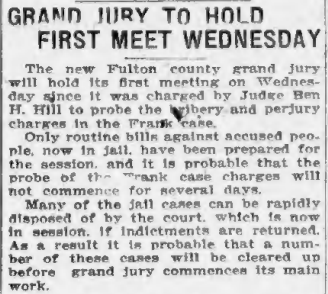 The new Fulton County Grand Jury will hold its first meeting on Wednesday since it was charged by Judge Ben H. Hill to probe the bribery and perjury charges in the Frank Case. Only routine bills against accused people, now in jail, have been prepared for the session, and it is probable that the probe of the Frank Case charges will not commence for several days.