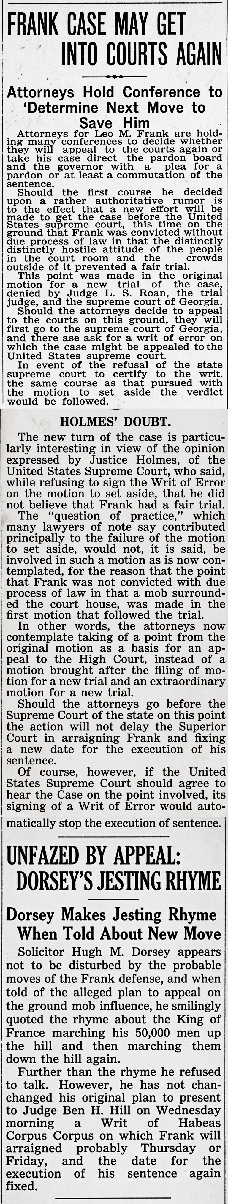 Solicitor Hugh M. Dorsey appears not to be disturbed by the probable moves of the Frank defense, and when told of the alleged plan to appeal on the ground of mob influence, he smilingly quoted the rhyme about the King of France marching his 50,000 men up the hill and then marching them down the hill again. Further than the rhyme, he refused to talk. However, he has not changed his original plan to present to Judge Ben H. Hill on Wednesday morning a Writ of Habeas Corpus, on which Frank will be arraigned probably Thursday or Friday, and the date for the execution of his sentence again fixed.