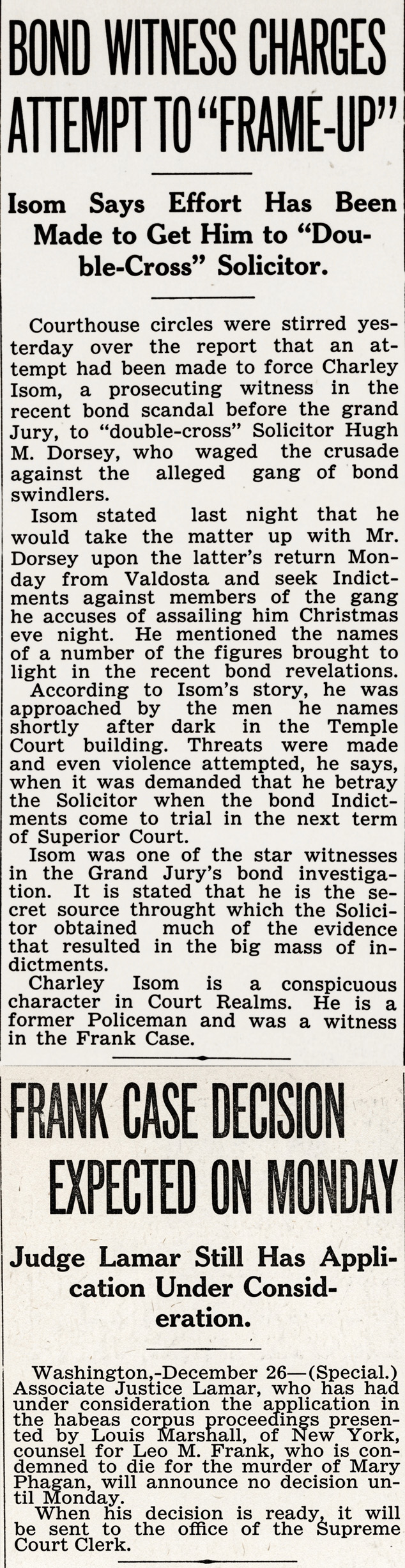 Isom Says Effort Has Been Made to Get Him to "Double-Cross" Solicitor. Courthouse Circles were stirred yesterday over the Report that an attempt had been made to force Charley Isom, a prosecuting witness in the recent bond scandal before the Grand Jury, to "double-cross" Solicitor Hugh M. Dorsey, who waged the crusade against the alleged gang of Bond swindlers.