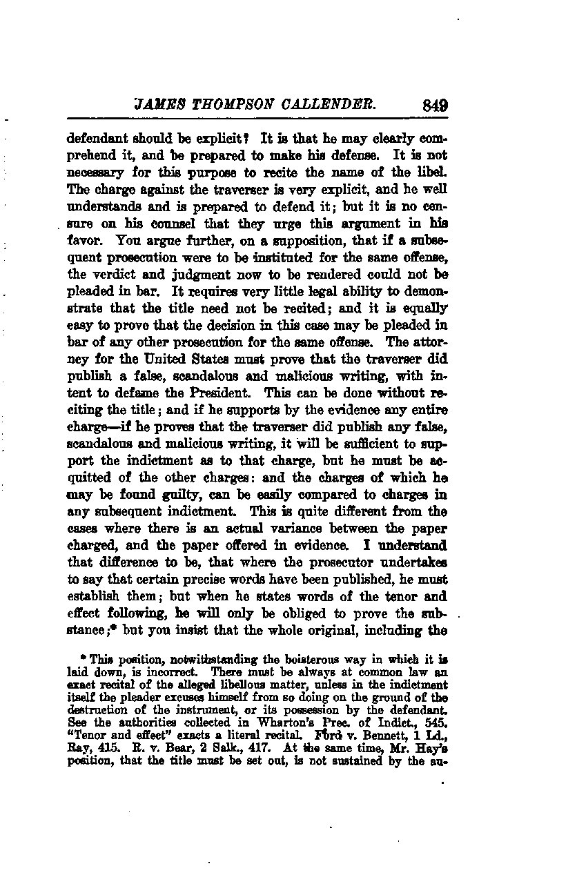 You further argue, on the supposition that if a subsequent prosecution were to be instituted for the same offense, the verdict and judgment now to be rendered could not be pleaded in bar. It requires very little legal ability to demonstrate that the title need not be recited; it is equally easy to prove that the decision in this case may be pleaded in bar of any other prosecution for the same offense. The attorney for the United States must prove that the defendant did publish a false, scandalous, and malicious writing with the intent to defame the President. This can be done without reciting the title; and if he supports by evidence any entire charge—if he proves that the defendant did publish any false, scandalous, and malicious writing—it will be sufficient to support the indictment as to that charge. However, he must be acquitted of the other charges, and the charges of which he may be found guilty can be easily compared to charges in any subsequent indictment.