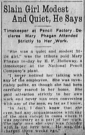 "I never noticed her talking with any of the employees. She was invariably polite, as though she had been carefully reared in her home. She paid attention strictly to her own work and never was seen conversing with any of the men, so far as I know.