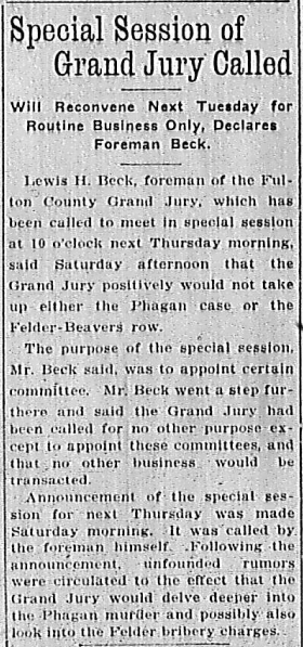 Announcement of the special session for next Thursday was made Saturday morning. It was called by the foreman himself. Following the announcement, unfounded rumors were circulated to the effect that the Grand Jury would delve deeper into the Phagan murder and possibly also look into the Felder bribery charges.