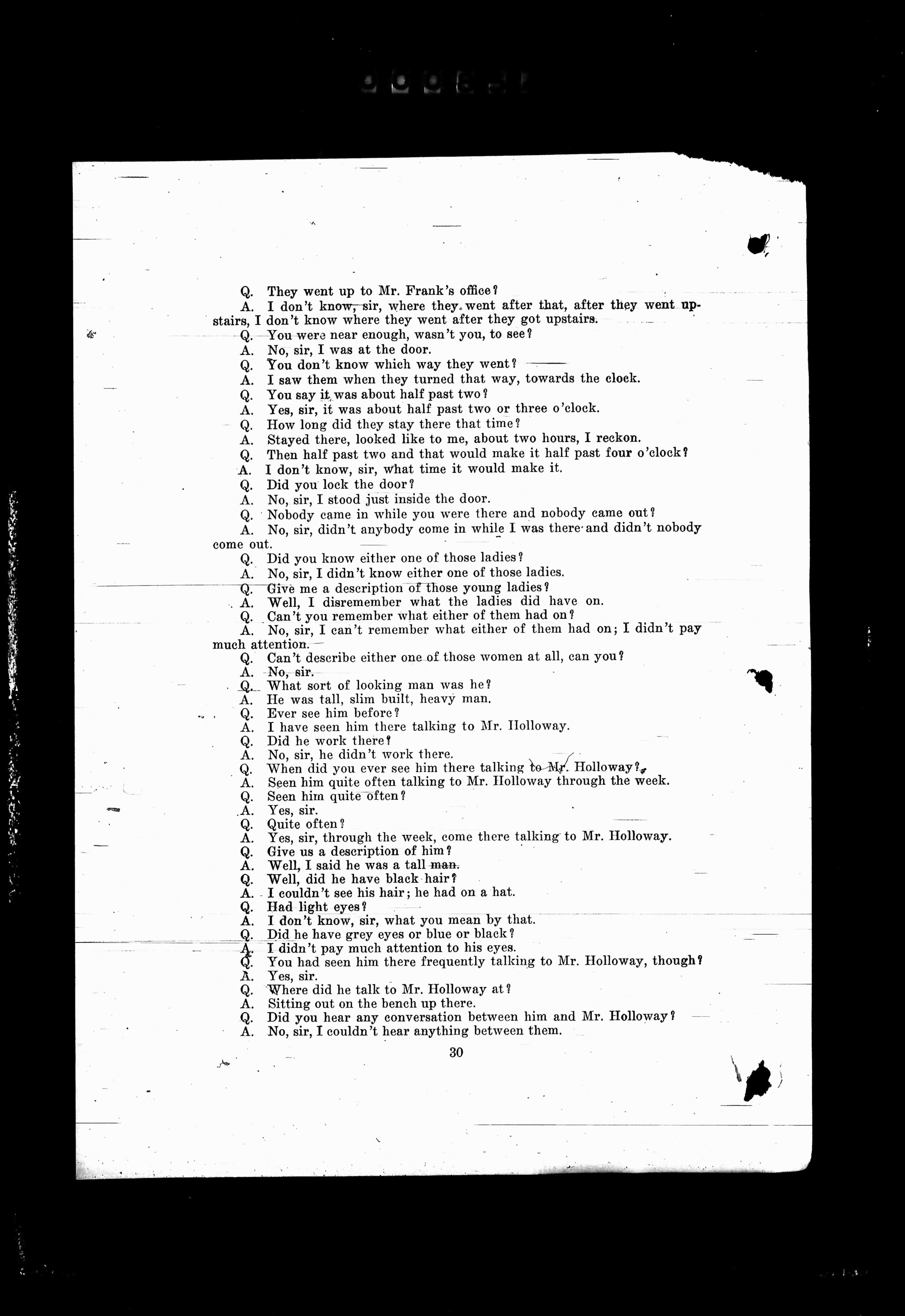 Visible Translated Text Is As Follows: Q. They went up to Mr. Frank's office?A. I don't know, sir, where they went after that, after they went up-stairs, I don't know where they went after they got upstairs.Q. You were near…