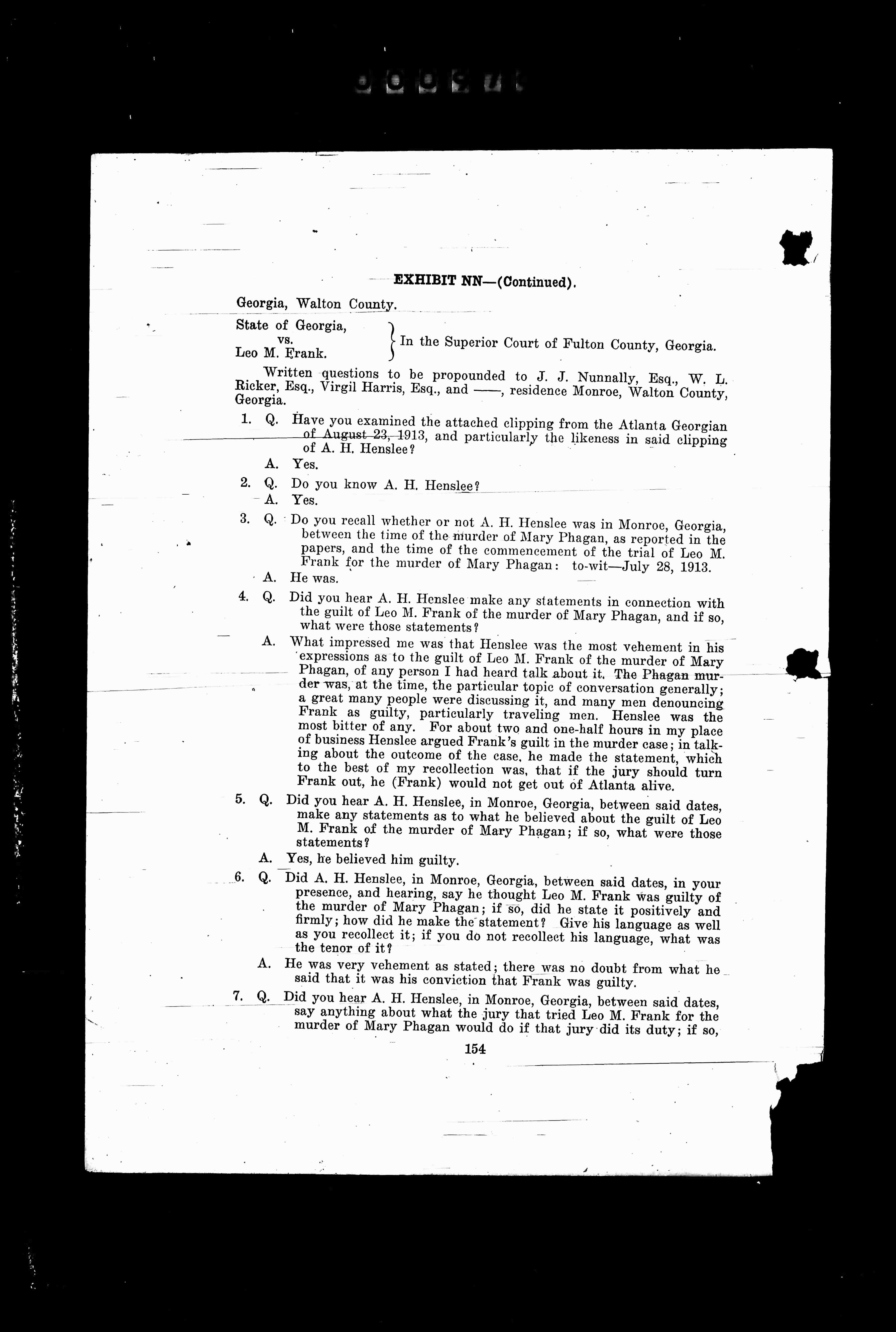 Visible Translated Text Is As Follows: EXHIBIT NN--(Continued).Georgia, Walton County.State of Georgia, vs. Leo M. Frank. In the Superior Court of Fulton County, Georgia.Written questions to be propounded to J. J. Nunnally, Esq., W. L. Ricker, Esq., Virgil Harris, Esq.,…