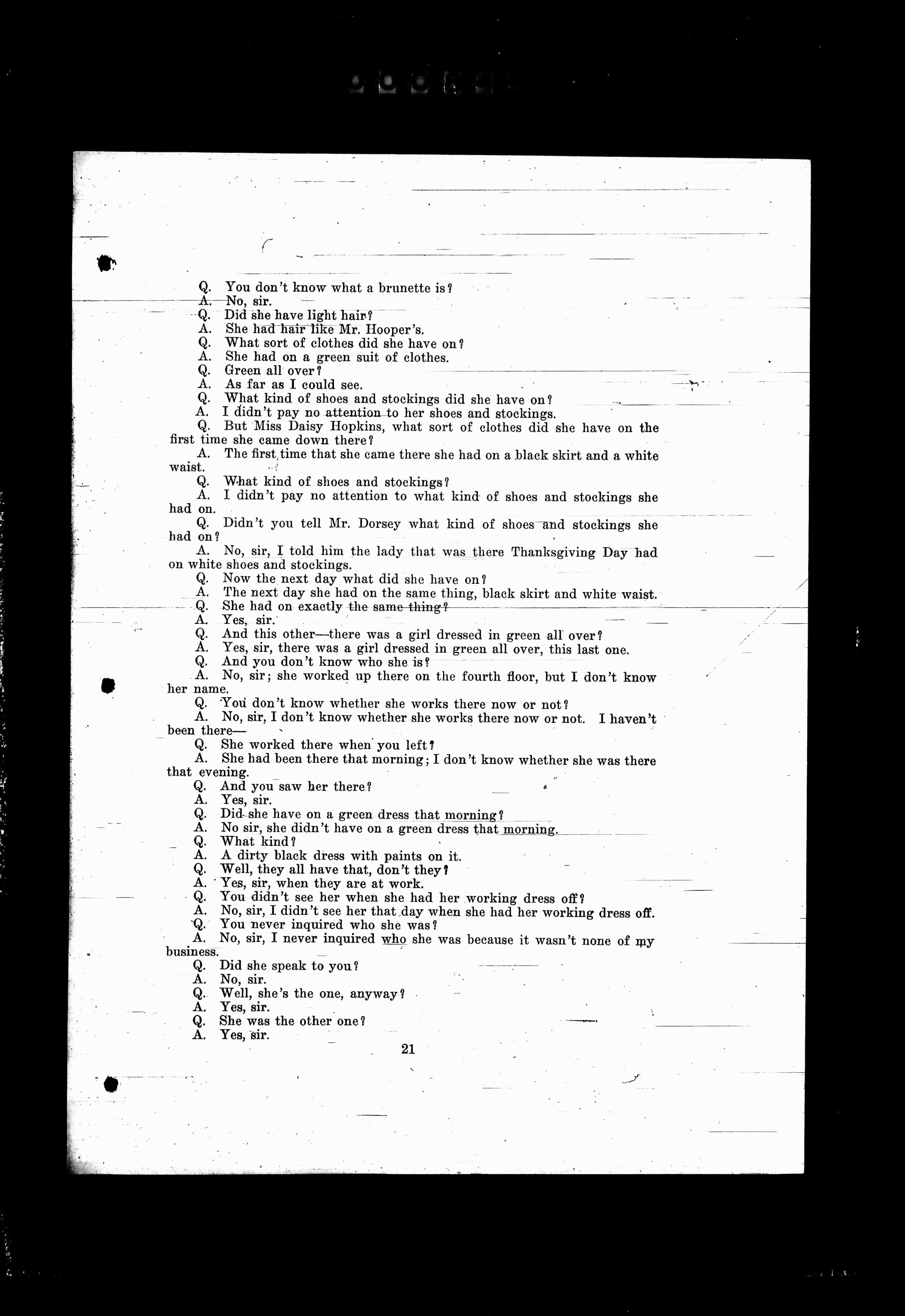 Visible Translated Text Is As Follows: Q. And she worked on the fourth floor?A. Yes, sir, she worked on the fourth floor.Q. Has she worked there in 1913?A. I don't know; I don't remember seeing her there; I don't know…