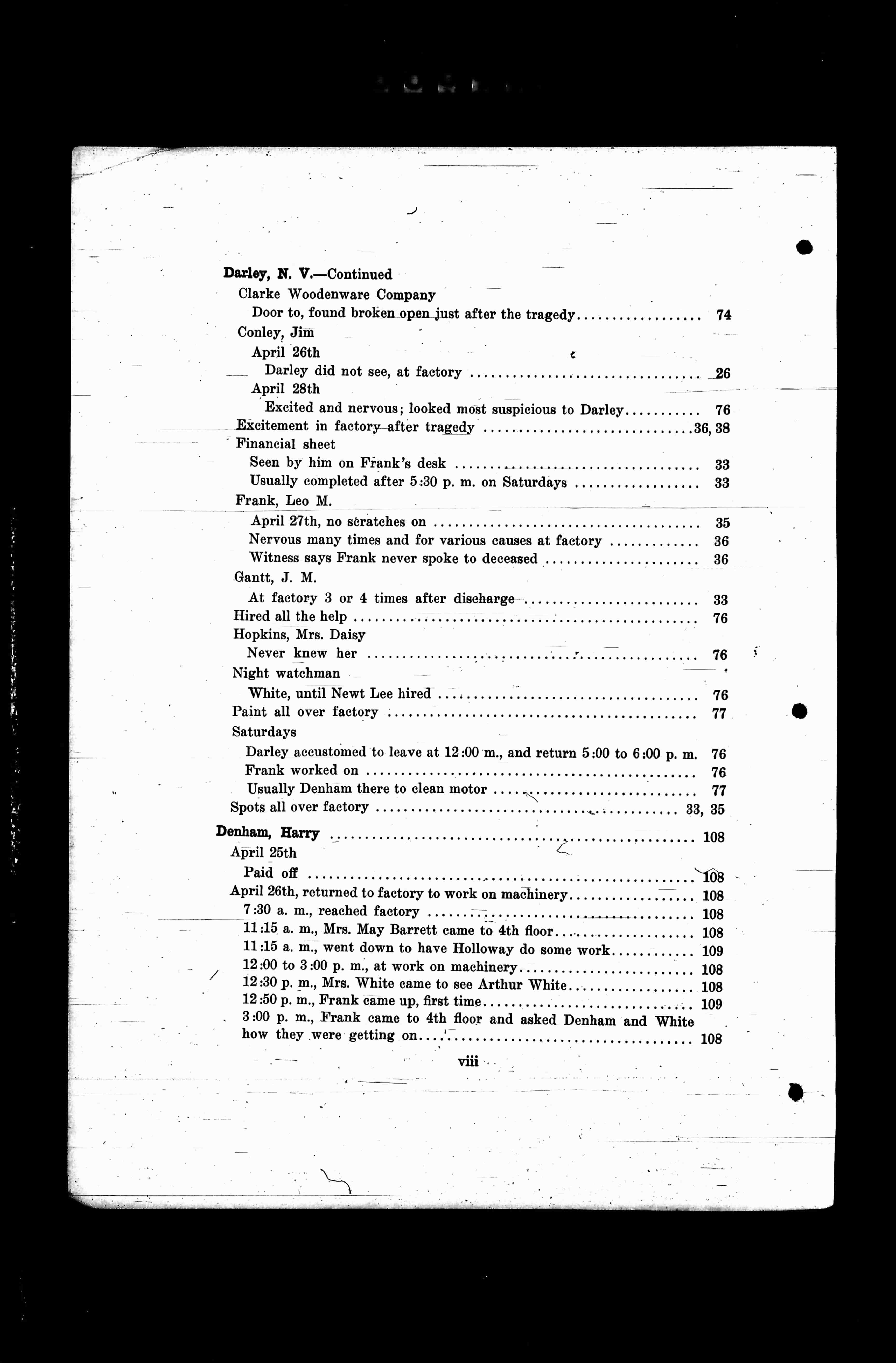 Visible Translated Text Is As Follows: Dariey, N. V.--ContinuedClarke Woodenware CompanyDoor to, found broken open just after the tragedy, Page 74.Conley, JimApril 26thDarley did not see, at factory, Page 26.April 28thExcited and nervous; looked most suspicious to Darley, Page 76.Excitement…