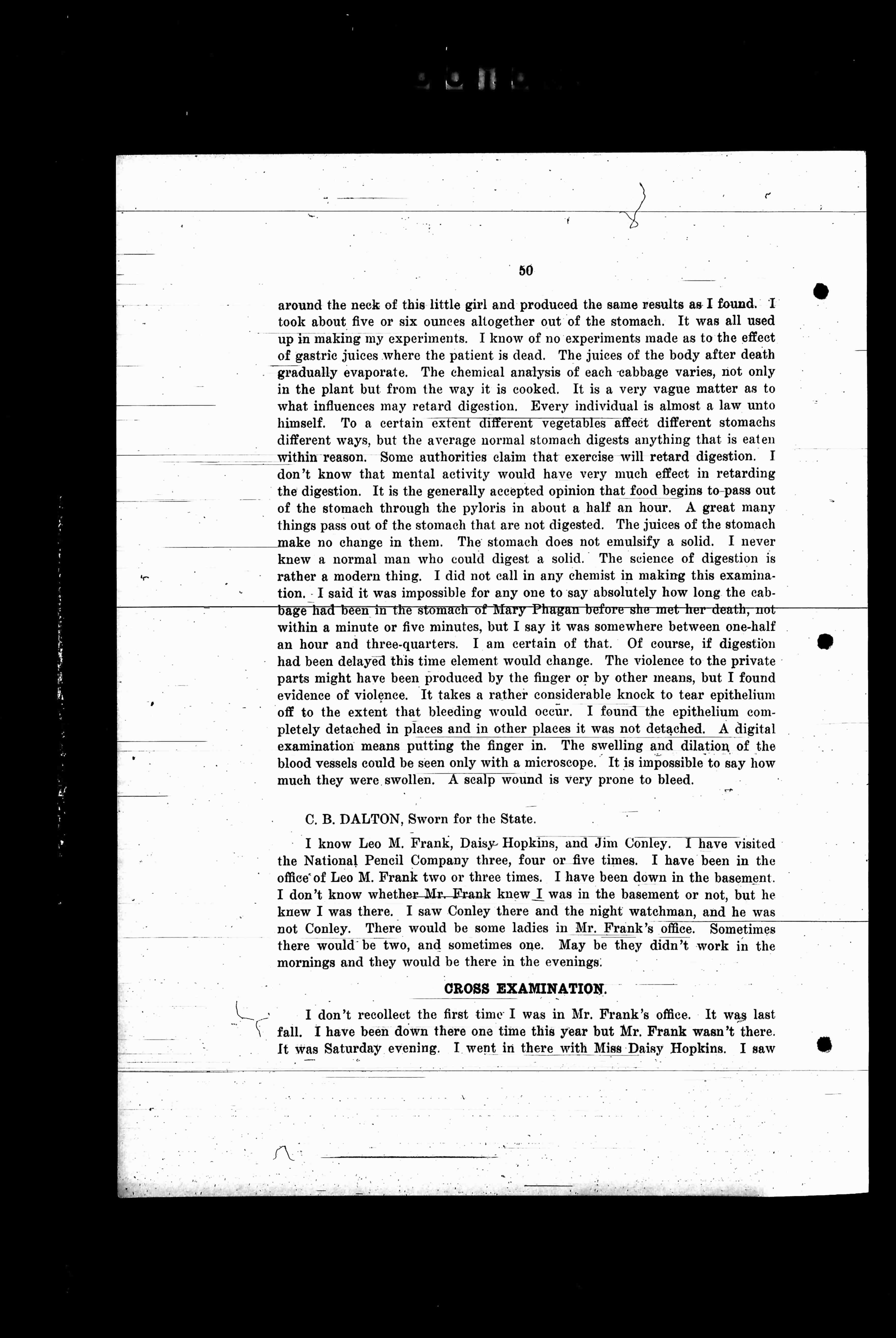 Visible Translated Text Is As Follows: 52RE-DIRECT EXAMINATION.Miss Daisy Hopkins knows Mr. Frank. I have seen her talking to him and she told me about it.S. L. ROSSER, sworn for the State.I am a city policeman. On Monday, April 28th,…