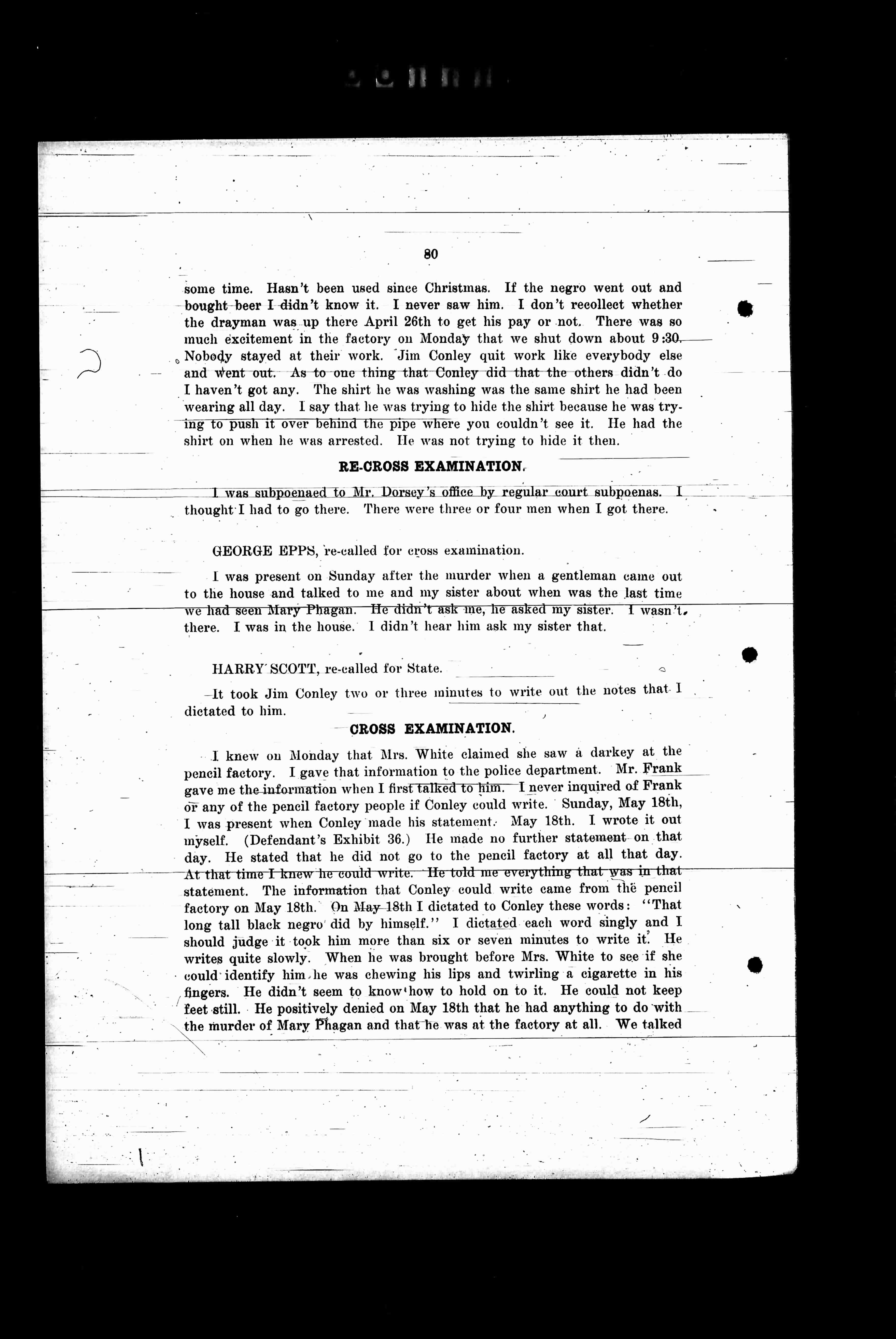 Visible Translated Text Is As Follows: 85passengers except Mary Phagan. As to what attracted my attention to Mary getting on the front end of the car, as a general rule when she would catch our car Mr. Matthews would say…