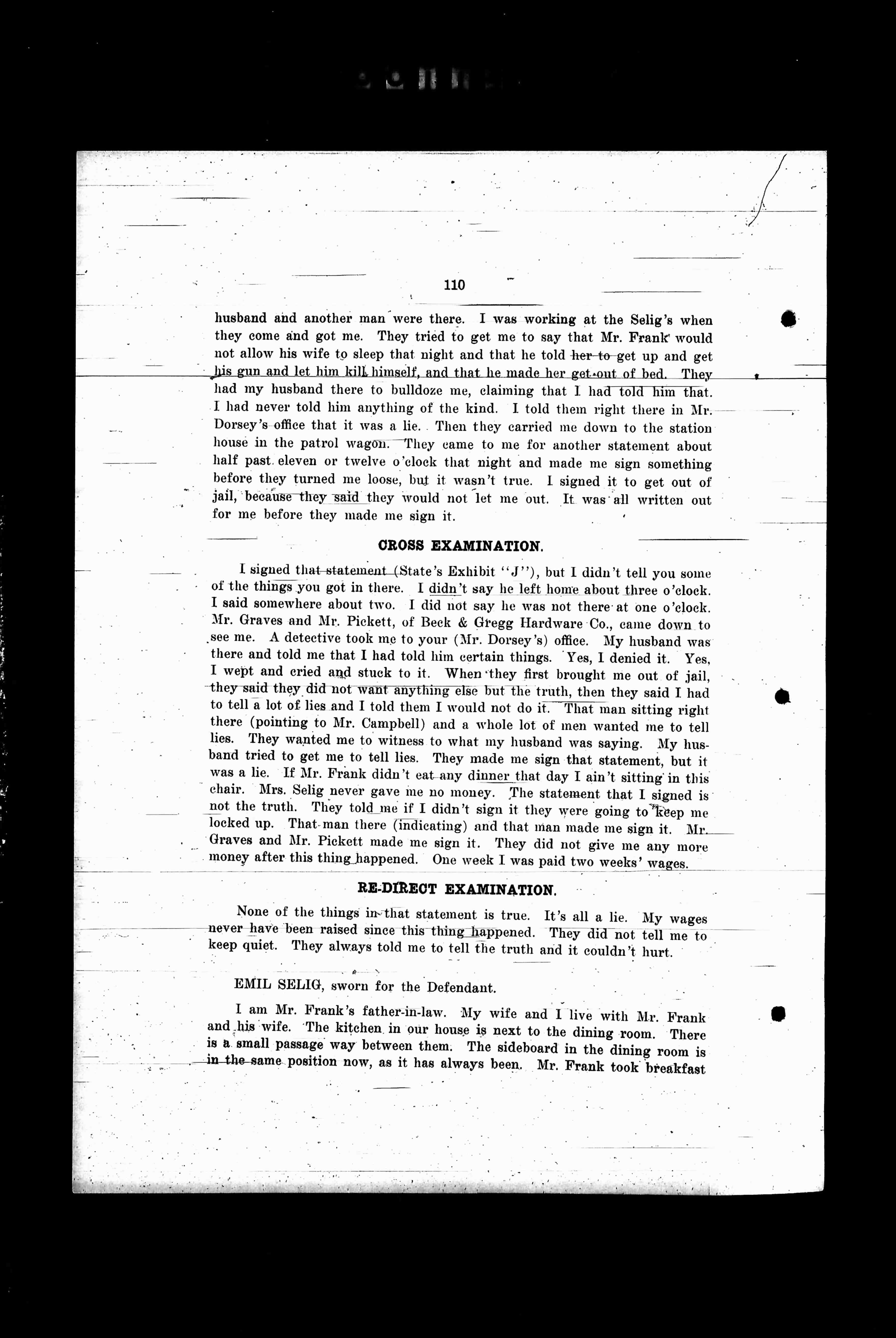 Visible Translated Text Is As Follows: 110husband and another man were there. I was working at the Selig's when they come and got me. They tried to get me to say that Mr. Frank would not allow his wife to…