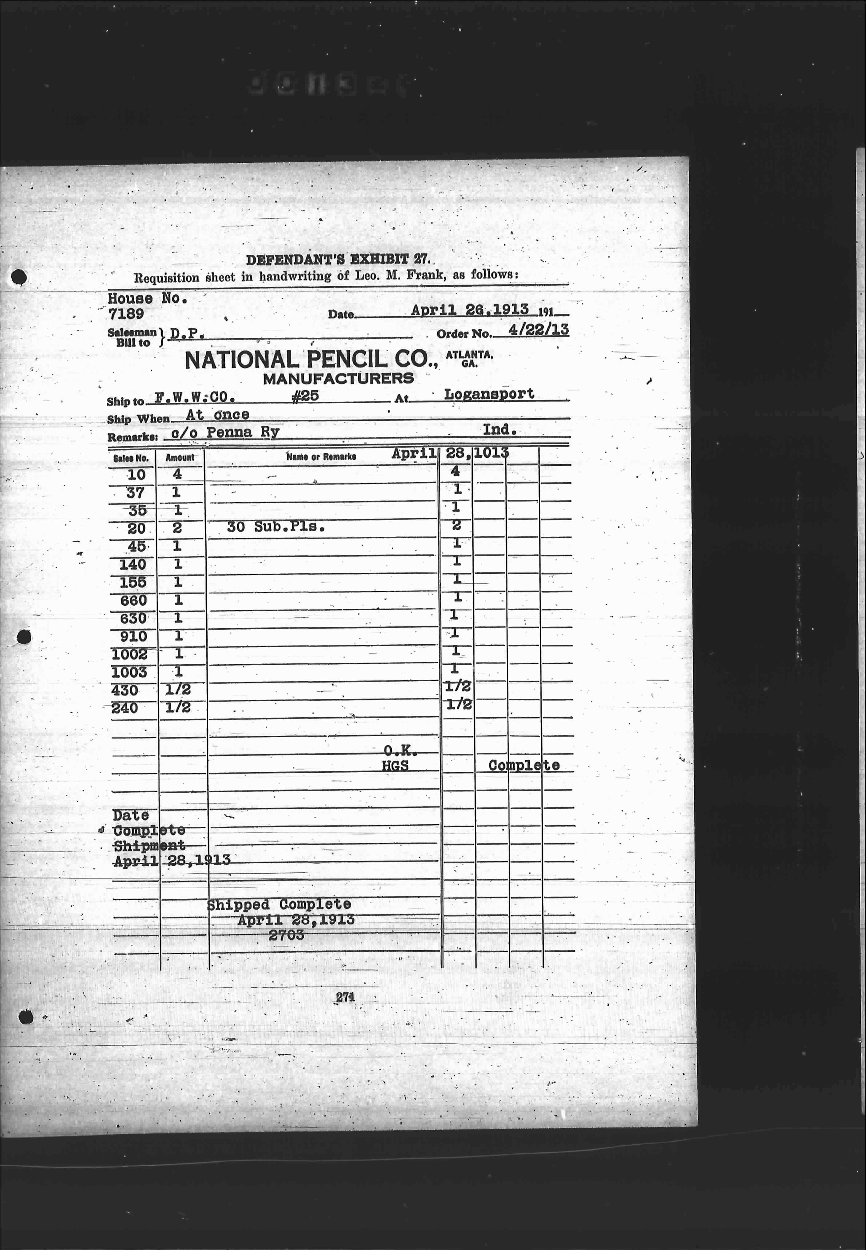 Visible Translated Text Is As Follows: DEFENDANT'S EXHIBIT 44Envelope in which Leo M. Frank's letter (Exhibit 42) to Moses Frank and weekly report (Exhibit 43) were enclosed, the address on said envelope being in Leo M. Frank's handwriting.L.M.Frankc/o NATIONAL PENCIL…