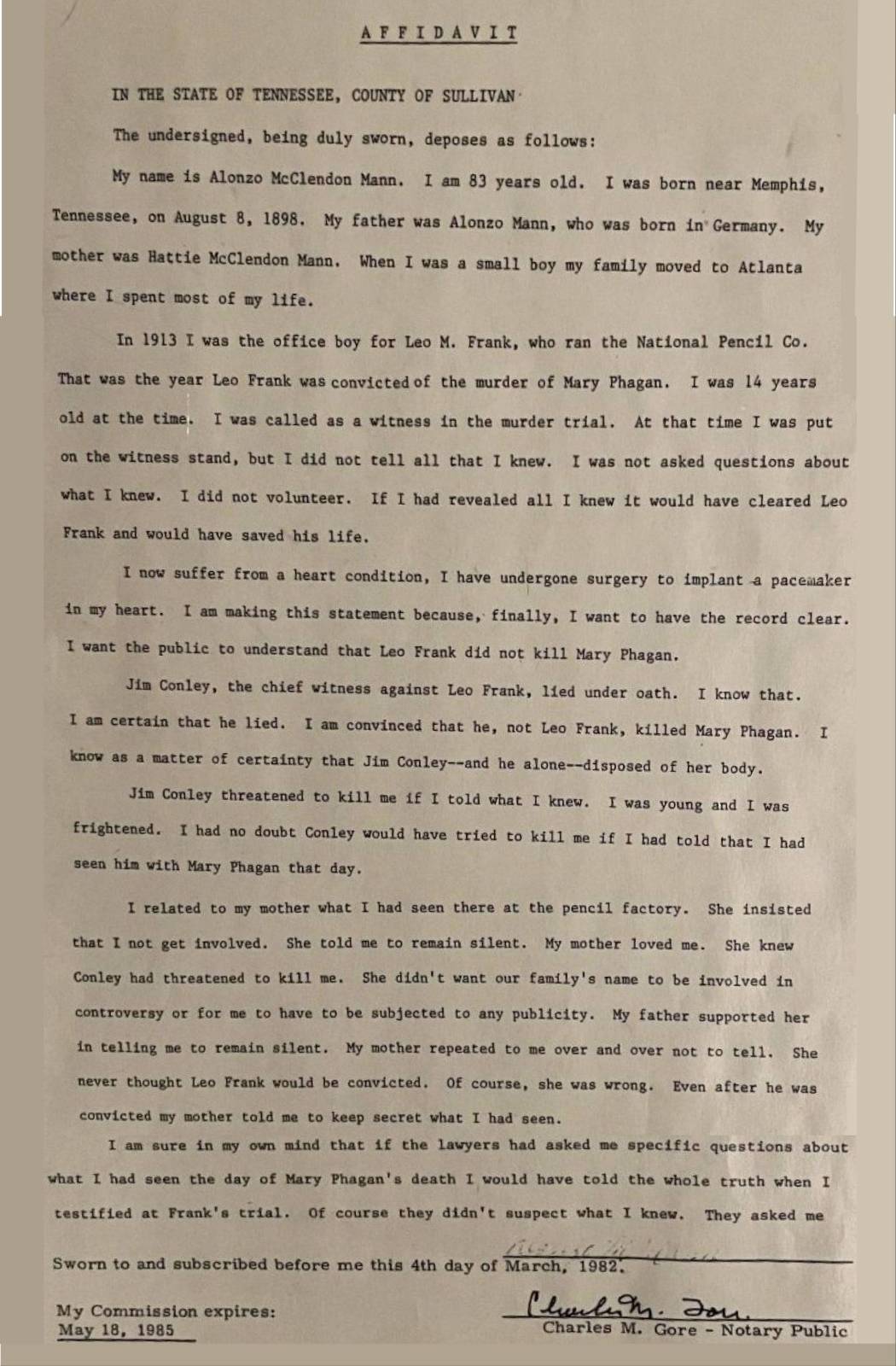 I now suffer from a heart condition, I have undergone surgery to implant a pacemaker in my heart. I am making this statement because, finally, I want to have the record clear. I want the public to understand that Leo Frank did not kill Mary Phagan.
