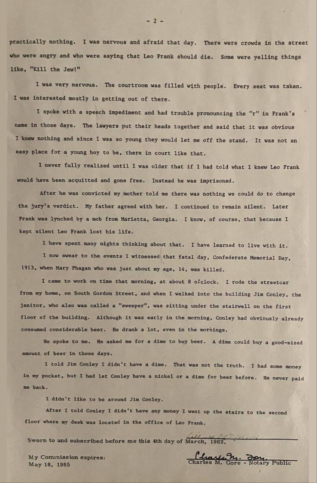 I now swear to the events I witnessed that fatal day, Confederate Memorial Day, 1913, when Mary Phagan who was just about my age, 14, was killed.