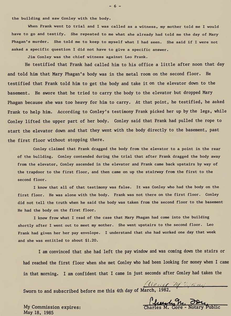 I know from what I read of the case that Mary Phagan had come into the building shortly after I went out to meet my mother. She went upstairs to the second floor. Leo Frank had given her her pay envelope. I understand that she had worked one day that week and she was entitled to about $1.20.