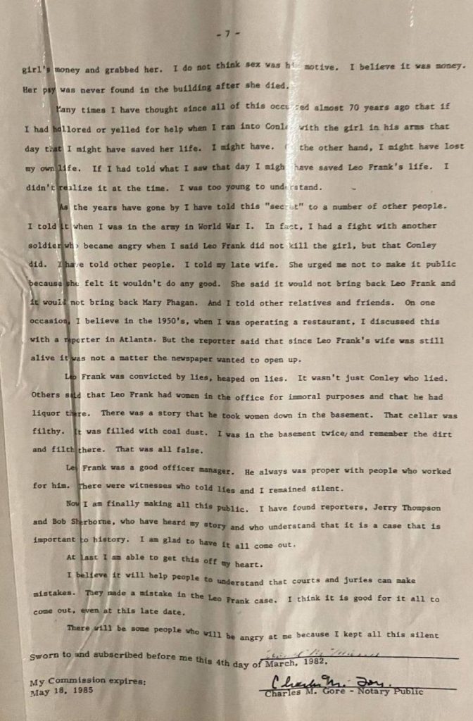 As the years have gone by I have told this "secret" to a number of other people. I told it when I was in the army in World War 1. In fact, I had a fight with another soldier who became angry when I said Leo Frank did not kill the girl, but that Conley did. I have told other people. I told my late wife. She urged me not to make it public because she felt it wouldn't do any good. She said it would not bring back Leo Frank and it would not bring back Mary Phagan. And I told other relatives and friends. On one occasion, I believe in the 1950's, when I was operating a restaurant, I discussed this with a reporter in Atlanta. But the reporter said that since Leo Frank's wife was still alive it was not a matter the newspaper wanted to open up.