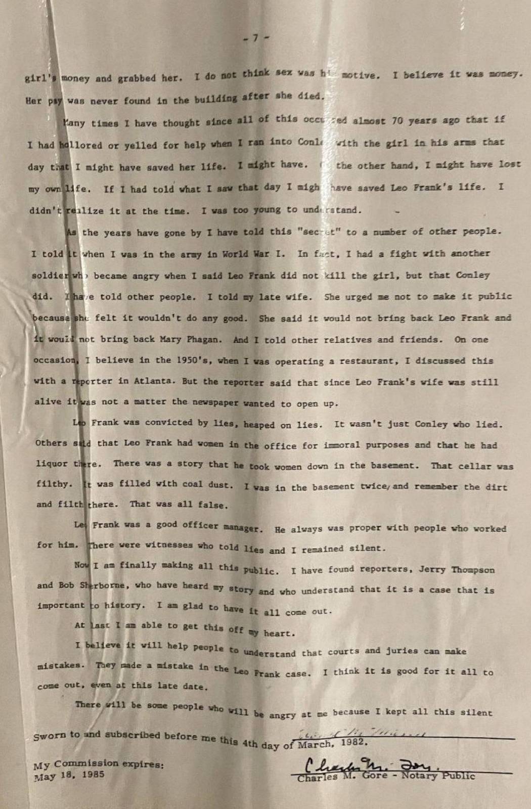 As the years have gone by I have told this "secret" to a number of other people. I told it when I was in the army in World War 1. In fact, I had a fight with another soldier who became angry when I said Leo Frank did not kill the girl, but that Conley did. I have told other people. I told my late wife. She urged me not to make it public because she felt it wouldn't do any good. She said it would not bring back Leo Frank and it would not bring back Mary Phagan. And I told other relatives and friends. On one occasion, I believe in the 1950's, when I was operating a restaurant, I discussed this with a reporter in Atlanta. But the reporter said that since Leo Frank's wife was still alive it was not a matter the newspaper wanted to open up.