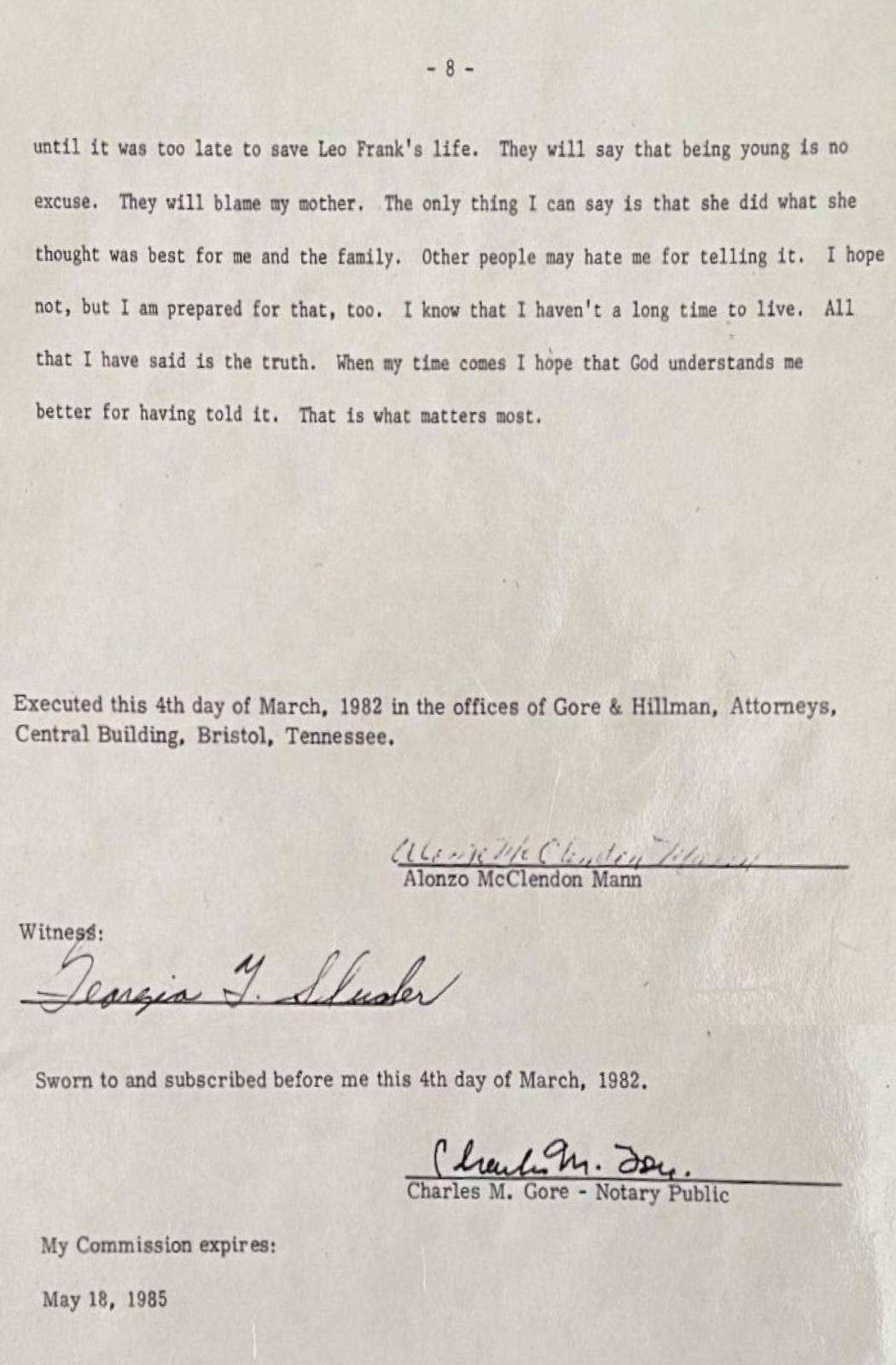 until it was too late to save Leo Frank's life. They will say that being young is no excuse. They will blame my mother. The only thing I can say is that she did what she thought was best for me and the family. Other people may hate me for telling it. I hope not, but I am prepared for that, too. I know that I haven't a long time to live. All that I have said is the truth. When my time comes I hope that God understands me better for having told it. That is what matters most.