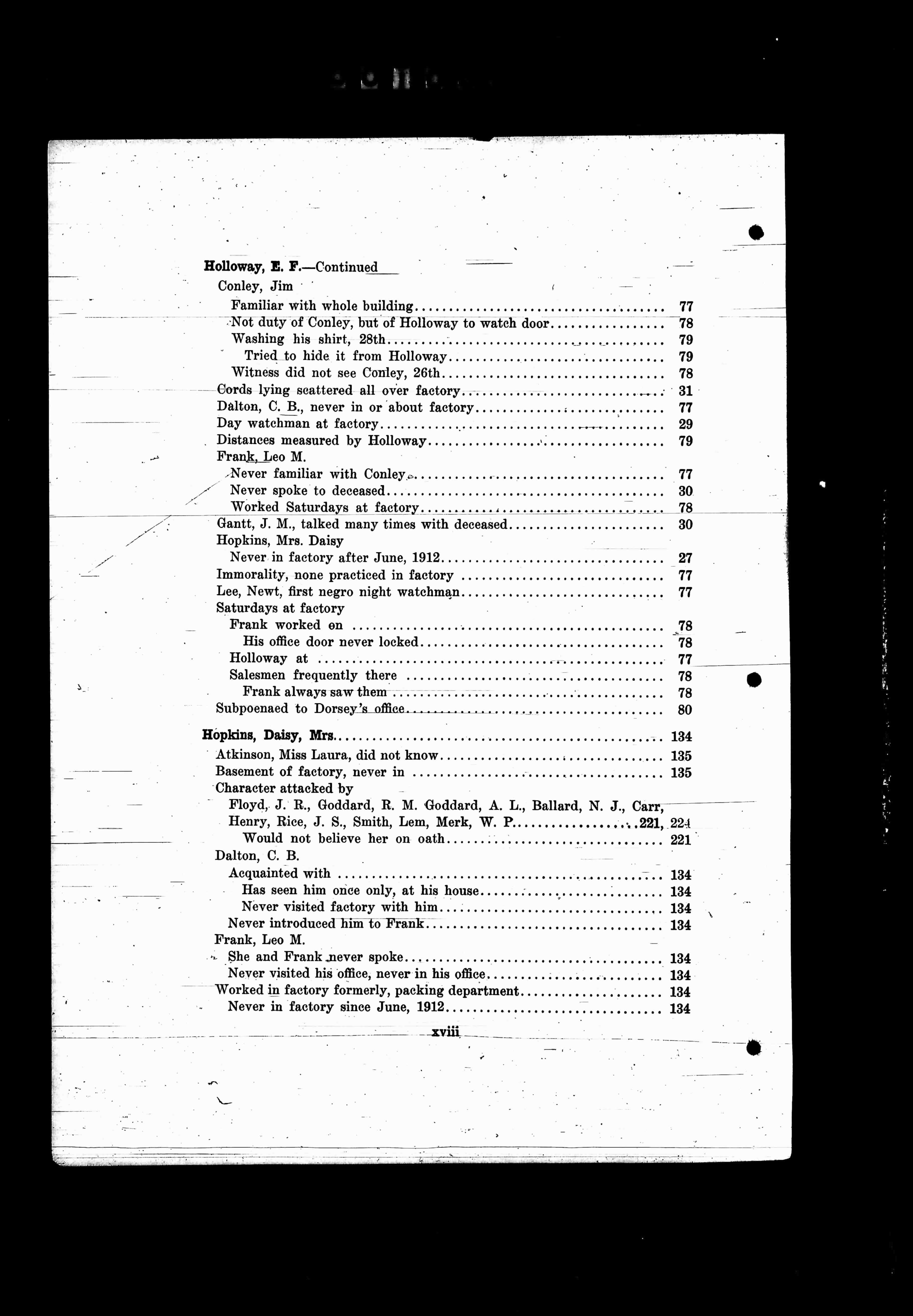 Visible Translated Text Is As Follows: Holloway, E. F. - ContinuedConley, JimFamiliar with whole building, Page 77.Not duty of Conley, but of Holloway to watch door, Page 78.Washing his shirt, 28th, Page 79.Tried to hide it from Holloway, Page 79.Witness…