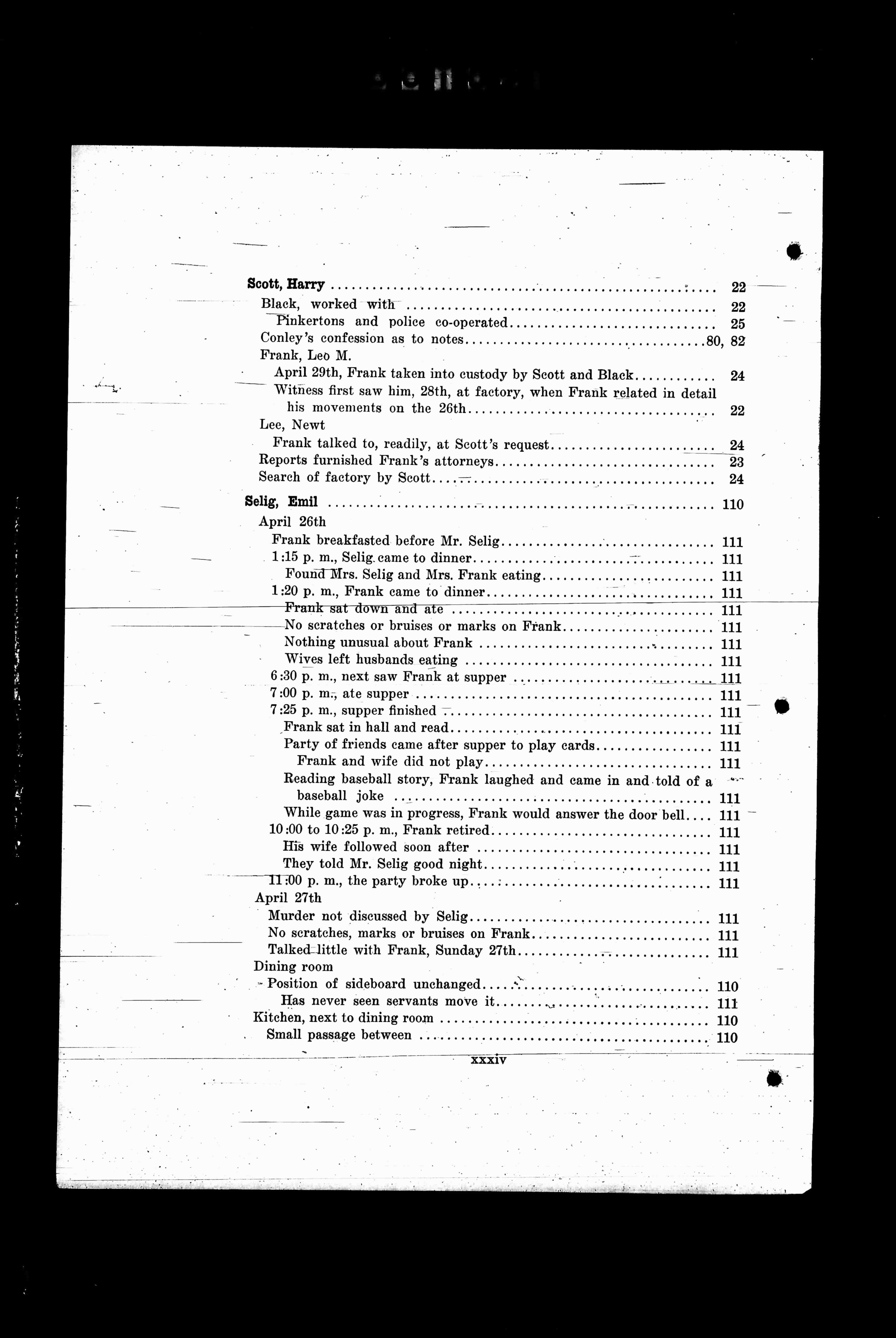 Visible Translated Text Is As Follows: Scott, Harry, Page 22.Black, worked with, Page 22.Pinkertons and police co-operated, Page 25.Conley's confession as to notes, Page 82.Frank, Leo M., Pages 80, 82April 29th, Frank taken into custody, by Scott and Black, Page…