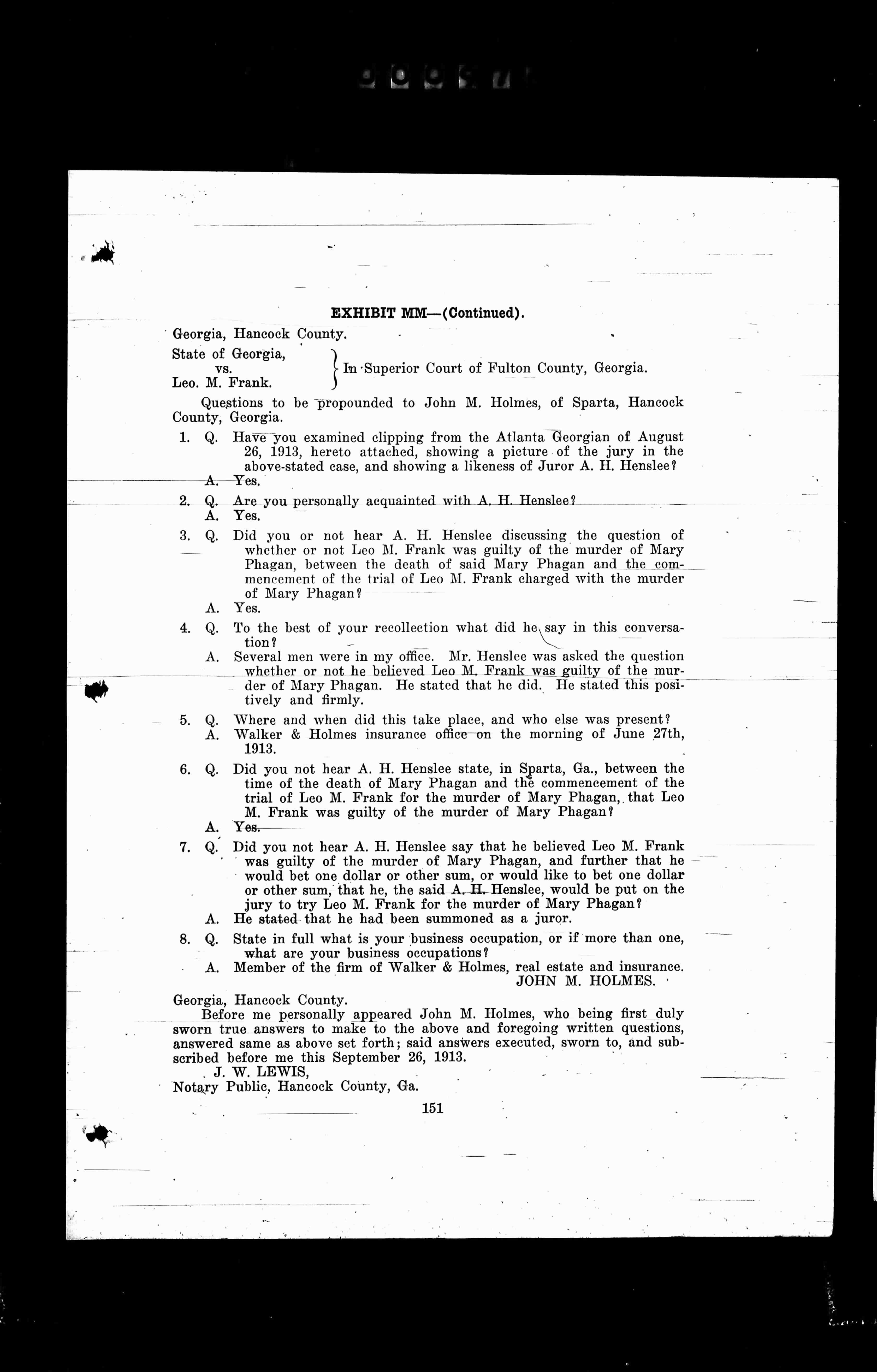 Visible Translated Text Is As Follows: EXHIBIT MM--(Continued).Georgia, Hancock County.State of Georgia, )vs. ) In Superior Court of Fulton County, Georgia.Leo. M. Frank. )Questions to be propounded to John M. Holmes, of Sparta, HancockCounty, Georgia.1. Q. Have you examined clipping…